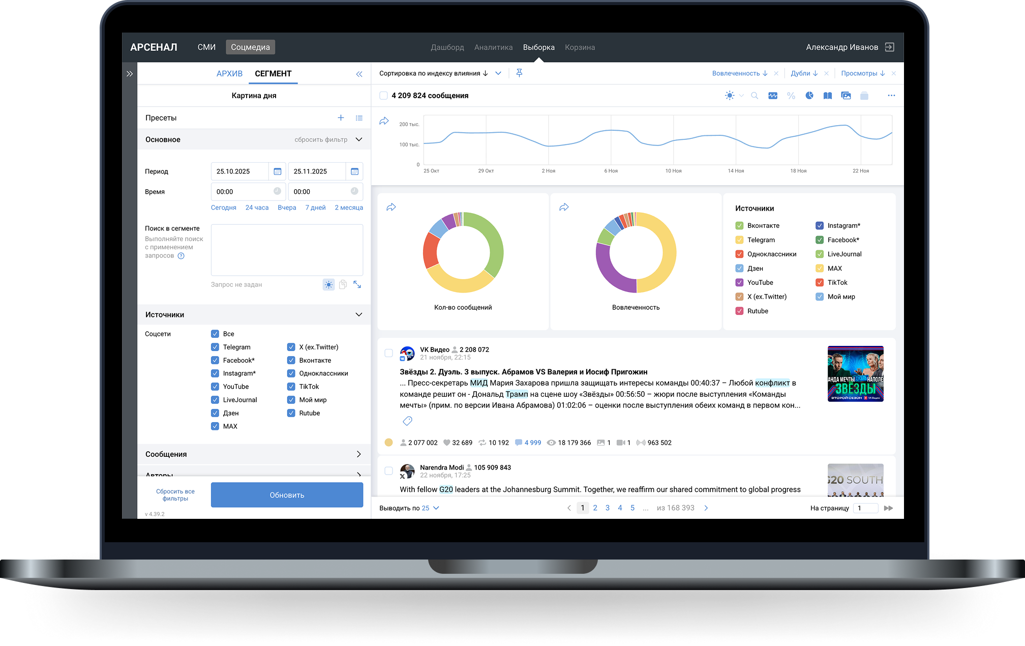 «Арсенал.Соцмедиа» это инструмент для анализа информационного поля соцсетей с функциями мониторинга и аналитики. Для поиска данных используется язык запросов, который удовлетворяет требованиям специалистов в области мониторинга, но также доступен и для широкого круга пользователей, не обладающих специальными знаниями в этой сфере. Результаты мониторинга в «Арсенал.Соцмедиа» формируются в виде отчетов и экспортируются в удобные для пользователя форматы. Доступен экспорт сообщений в .xlsx с полными текстами, а также .docx.